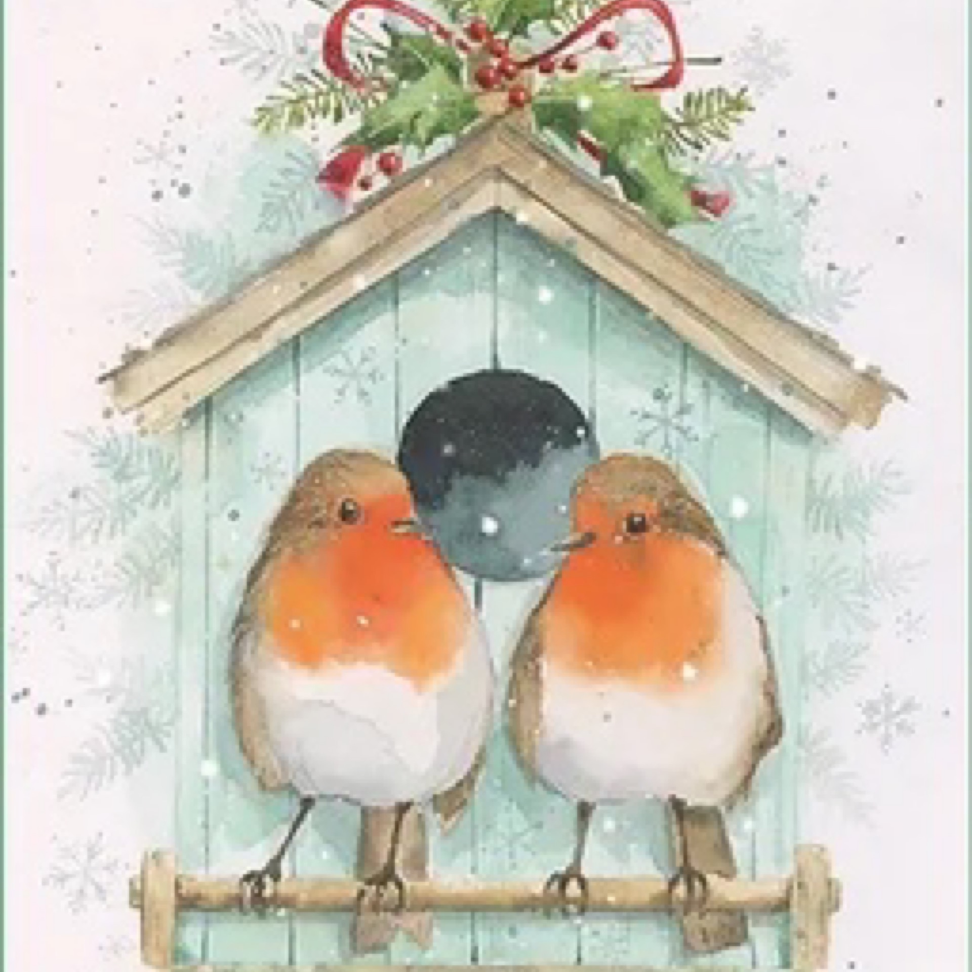 Two friendly robins sit on a perch in front of a festive birdhouse on this Christmas card. Measures 121 mm x 171 mm. Message inside reads ‘Seasons Greetings’.